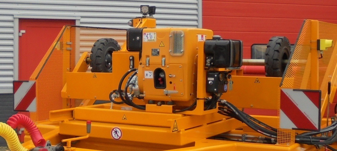 The ZW-7-35 is a hydraulic rewinding machine with CE Marking developed especially for the ZW(V) cable drum trailer series. This machine has a telescopic frame and is built onto the cable drum trailer. The ZW-7-35 has a compact hydro unit with petrol engine. The drum is driven via solid, width-adjustable drive wheels that are pressed against the drum flanges. The speed is continuously adjustable and two directions of rotation are possible, so that this machine can be used for winding and unwinding. The ZW-7-35 can be blasted and metallised and can be supplied with a cover if required.